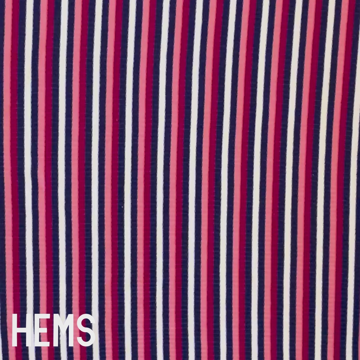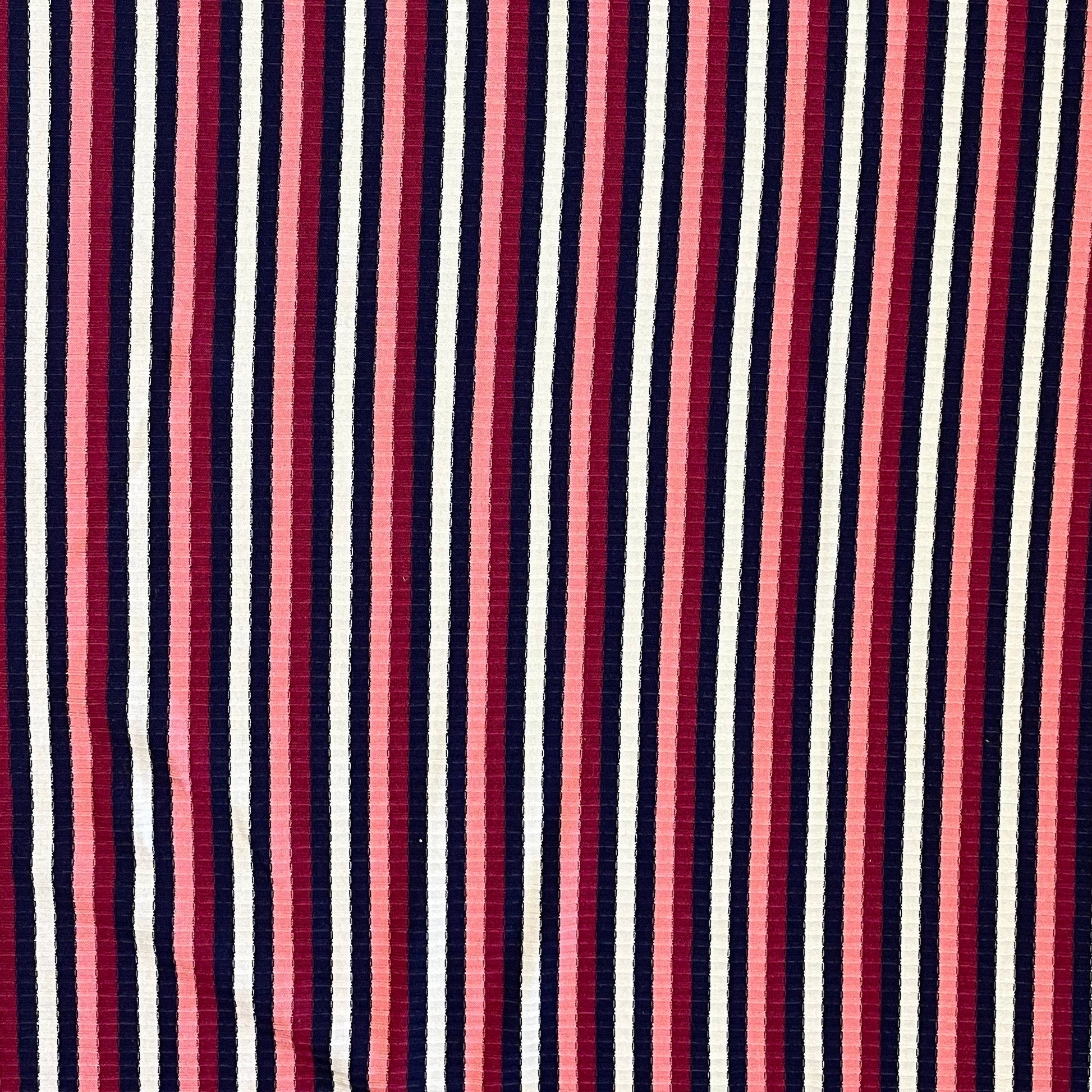 Stretchy. Textured. Made to move. This ribbed knit fabric features pink, red, purple, and white stripes, adding comfort and subtle texture to your everyday makes. Ideal for cuffs, collars, tops, dresses, or full garments with a close, flexible fit.